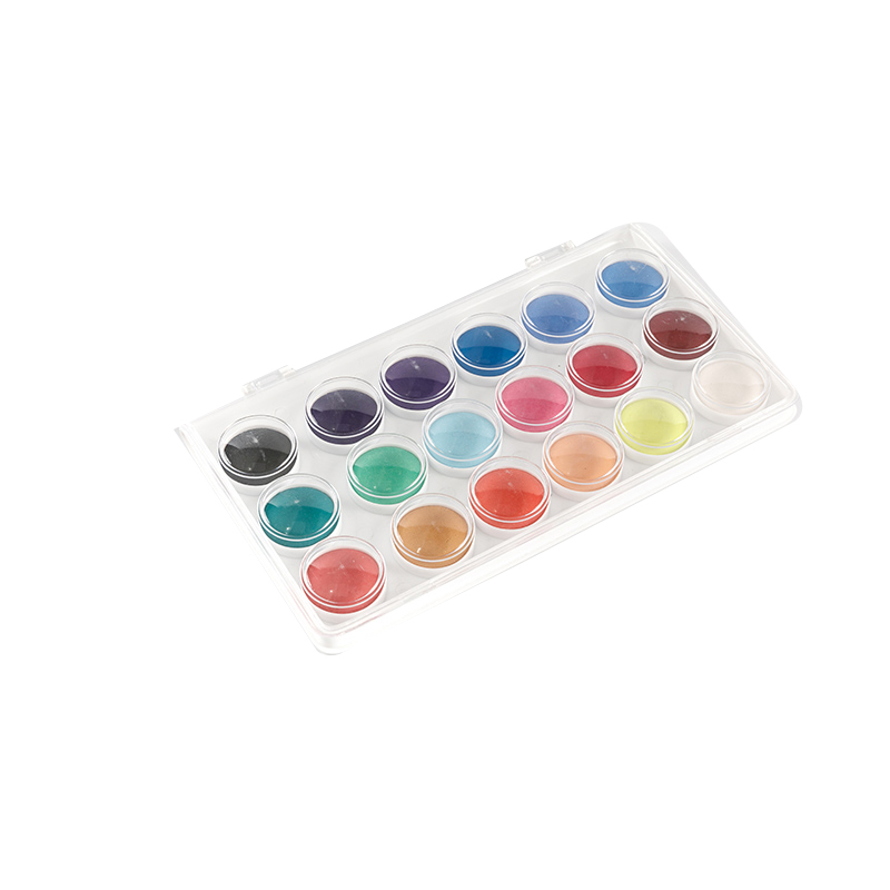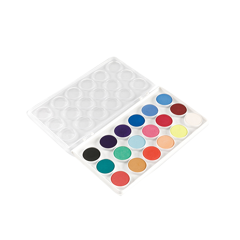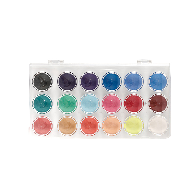 வாட்டர்கலர்ஸ் பெயிண்ட் செட் இளம் கலைஞருக்கு 18 வண்ணங்களின் சிறந்த பேக் ஆகும். உடலுக்கான தெளிவான பிளாஸ்டிக், நவீன வட்ட வடிவத்துடன், பிடிக்க எளிதானது மற்றும் பயன்படுத்த வசதியானது. வரைதல் அல்லது ஓவியம் வரைவதற்கு எளிதாக நிரப்புவதற்கு சுத்தமான, பணக்கார நிறங்களை அனுமதிக்கும் வண்ணம் தண்ணீரில் நீர்த்தப்படலாம்.